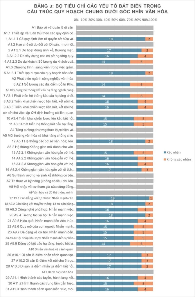 Tóm lại, trên cơ sở về Quy định bảo vệ và quản lý Di sản thế giới của UNESCO; Công ước bảo vệ Di sản văn hóa phi vật thể của UNESCO; Bộ chỉ số văn hóa chuyên đề trong Chương trình nghị sự 2030 của UNESCO; Nguyên tắc tạo lập đô thị thông minh tại các quốc gia phát triển thì Bộ tiêu chí về các yếu tố bất biến trong Quy hoạch chung Thủ đô Hà Nội dưới góc nhìn văn hóa, gồm 7 nhóm tiêu chí hay mục tiêu: i) Bảo vệ và quản lý di sản; ii) Phát triển ngành Công nghiệp văn hóa; iii) Xây dựng hệ thống kết cấu hạ tầng cho ngành Công nghiệp văn hóa; iv) Môi trường văn hóa và khả năng chống chịu; v) Văn hóa và đô thị thông minh; vi) Di sản văn hóa và cảnh quan; vii) Danh hiệu văn hóa. Mỗi nhóm có một số tiêu chí, tổng cộng có 31 tiêu chí cụ thể. Tuy nhiên, đề tài vẫn luôn trân trọng và mong có thêm nhiều sự đóng góp của các lãnh đạo, nhà quản lý, chuyên gia quy hoạch để hoàn thiện Bộ tiêu chí thêm nữa.